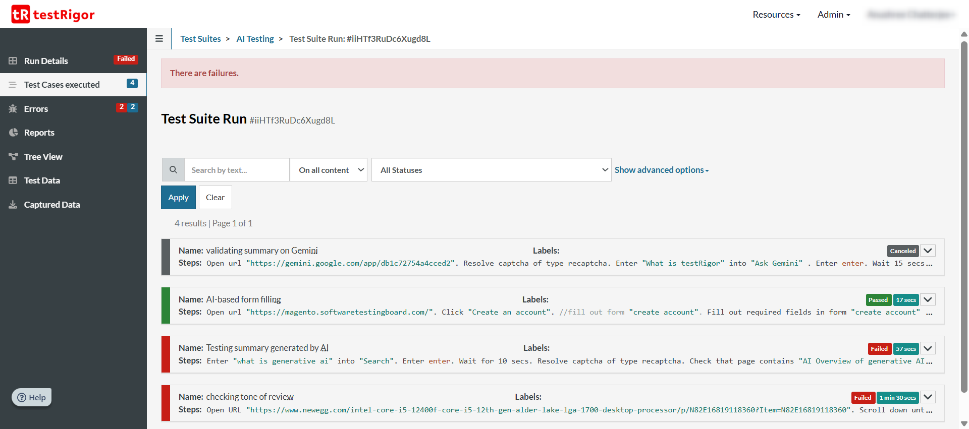 You can view these 21 CFR Part 11 compliant test results from a couple of places within testRigor.