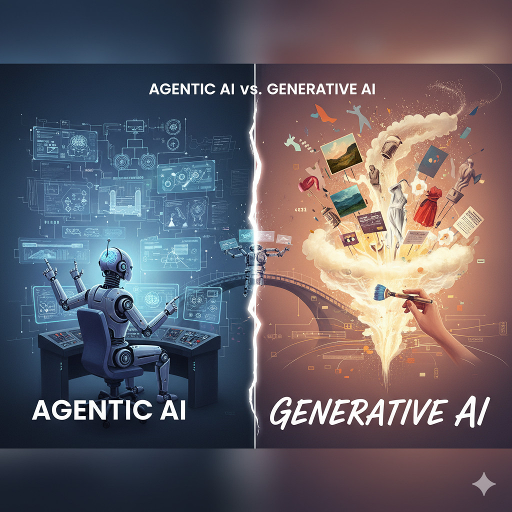 Artificial Intelligence (AI) is swiftly turning into an array of various branches, each one intended to fulfill specific tasks. Two of these are the Agentic AI and Generative AI; they are powerful, but fundamentally different approaches. Systems that make autonomous decisions are more oriented towards agentic AI, and allow the systems to work, act, and interact with their environment with minimal human assistance. These AI agents are goal-oriented and work based on designing, thinking, and implementing plans to attain particular results.