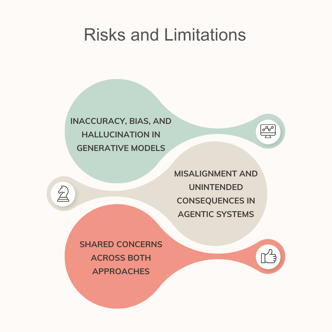 There are some risk factors that are shared between generative and agentic AI and have different characters. One of the significant challenges is accountability, it’s hard to hold these systems accountable when they get things wrong or cause harm, especially if they’re self-operating. Both also come with risks of misuse, through which people can use them to spread misinformation, orchestrate cyberattacks or perpetuate dangerous automation. Read: Top 10 OWASP for LLMs: How to Test?