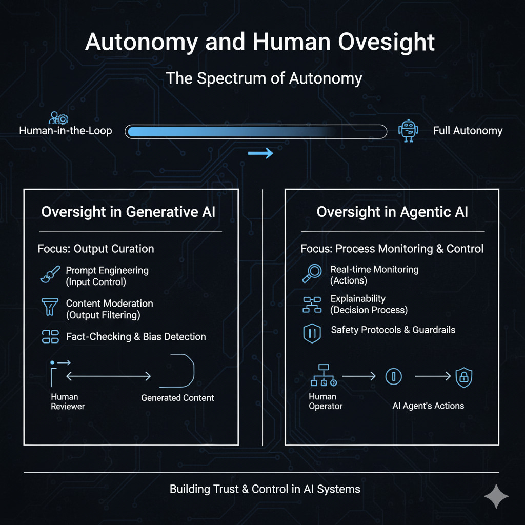 The agentic AI is more independent and may often make real-time decisions. Monitoring performance and setting limits are some of the elements of oversight with respect to making sure that systems are responsible in their actions.