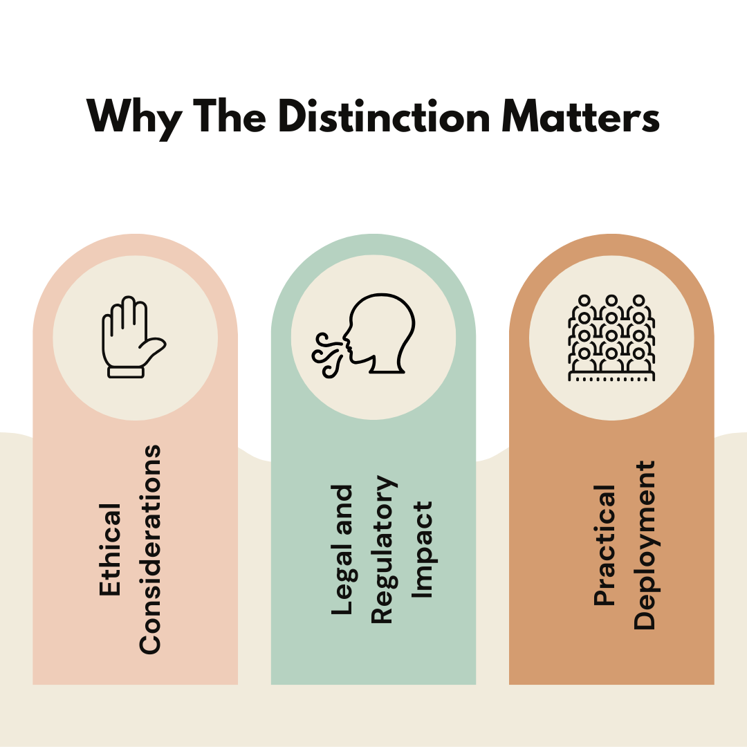 The distinction between agency and autonomy is crucial in AI decision-making, especially for responsibility and accountability. Agency suggests purposeful actions by AI, but keeps humans, creators, or operators as ultimately responsible. Autonomy implies self-regulation without human interference. This difference also shapes AI design and monitoring, with agency allowing for oversight and autonomy, emphasizing independent decision-making. Ethically, agency highlights the need for AI systems to make morally viable decisions in cooperation with humans, while autonomy raises concerns over adaptability and control. Finally, in governance, highly autonomous systems, such as autonomous weapons, demand stricter regulation to ensure safety and prevent misuse.