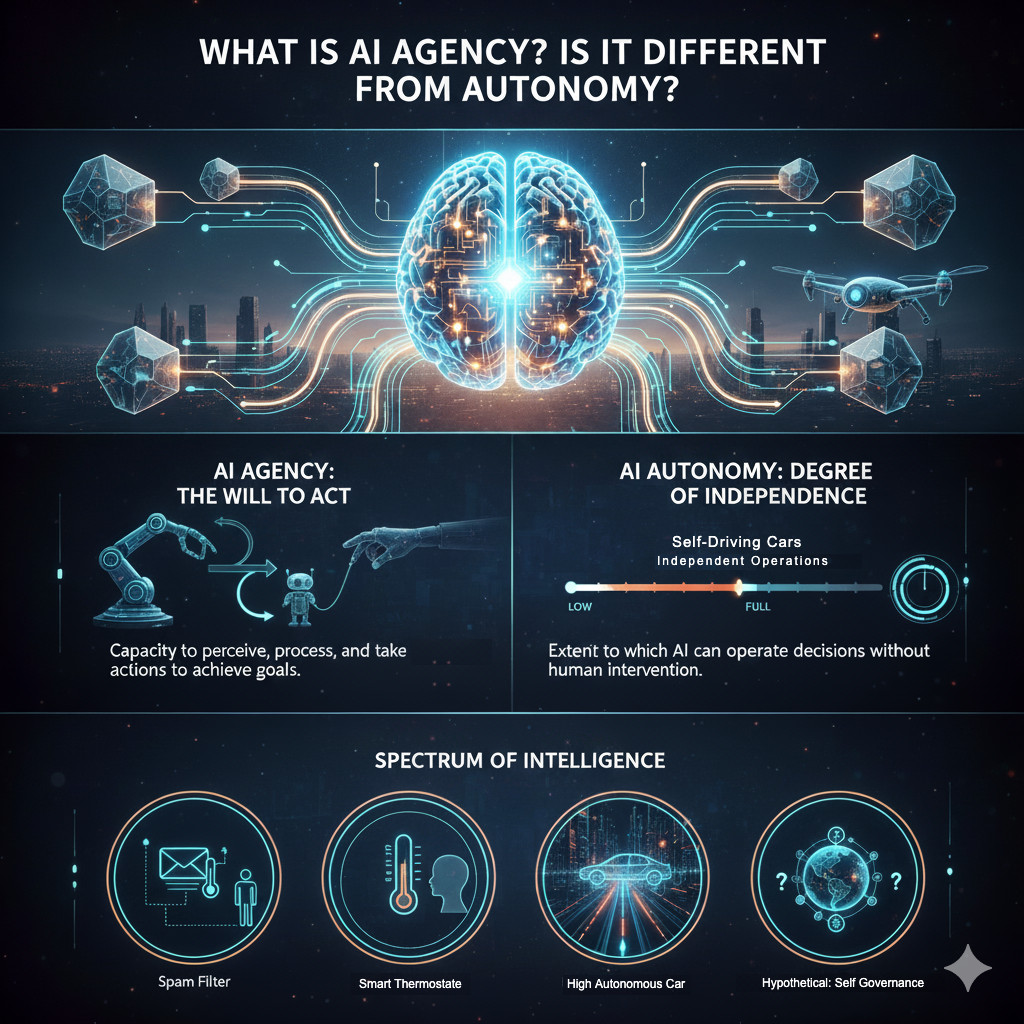 AI agency and autonomy are complementary but distinct concepts. Recognizing this distinction allows developers, regulators, and society to design safer AI, allocate responsibility clearly, and embrace AI’s potential without ceding uncontrolled power to machines.