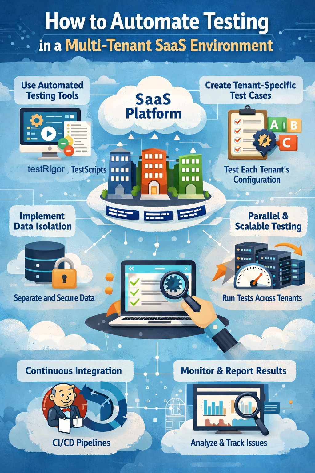 • Multi-tenant SaaS testing requires tenant-aware automation that accounts for configuration, roles, and isolation from day one.