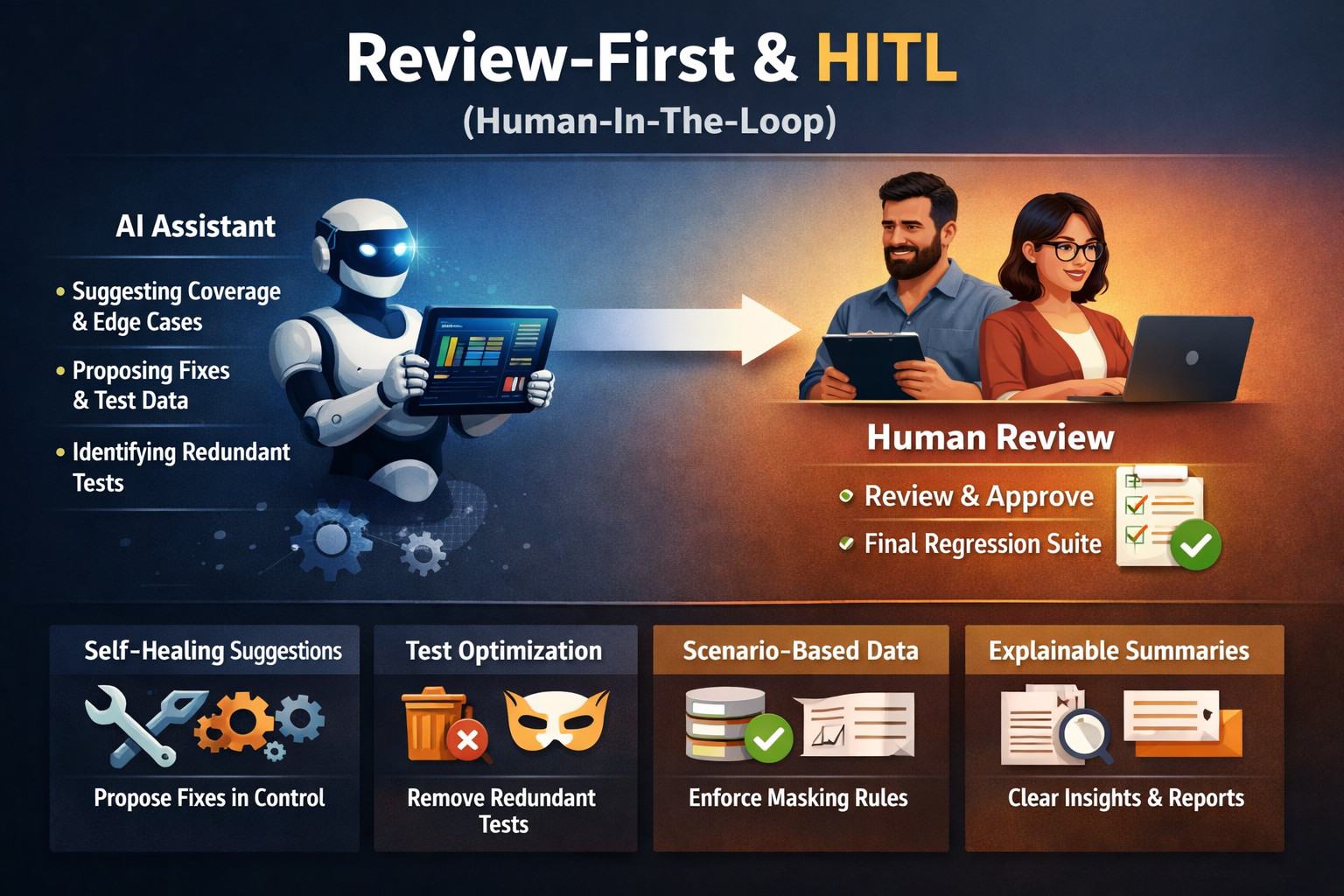The better approach is review-first governance and having HITL (Human-In-The-Loop). AI can be used for suggesting coverage, edge cases, and acceptance criteria. But then humans must remain accountable for what becomes part of the final regression suite.