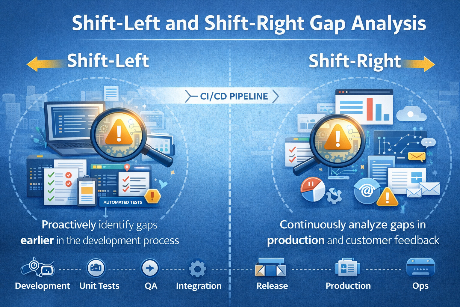 Modern QA gap analysis must extend beyond the testing phase and cover the entire software lifecycle. By examining both shift-left and shift-right gaps, teams can identify where quality risks originate early and where learning breaks down after release.