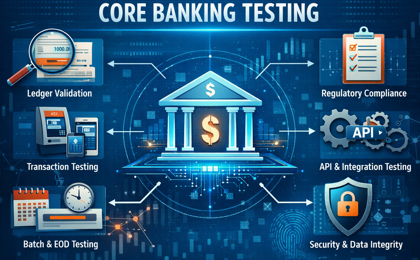 - Channel Integration Testing: Ensures a smooth flow of transactions between core banking and customer touch-point channels, including mobile banking, internet banking, and ATMs, as well as teller systems at branches. It provides consistent balances, live updates, and the same business rules for all access points.