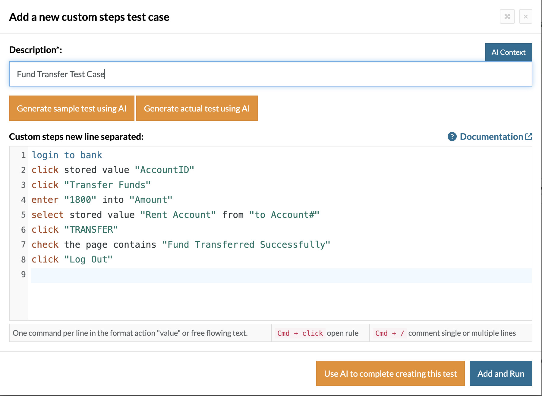 See, the above login steps changed to one short text, which is the re-usable function. Now, again, if you see, we are not calling the actual AccountID value anywhere, we are able to save it as a stored value and use it anywhere in the testcase, thereby giving maximum security to the customer.