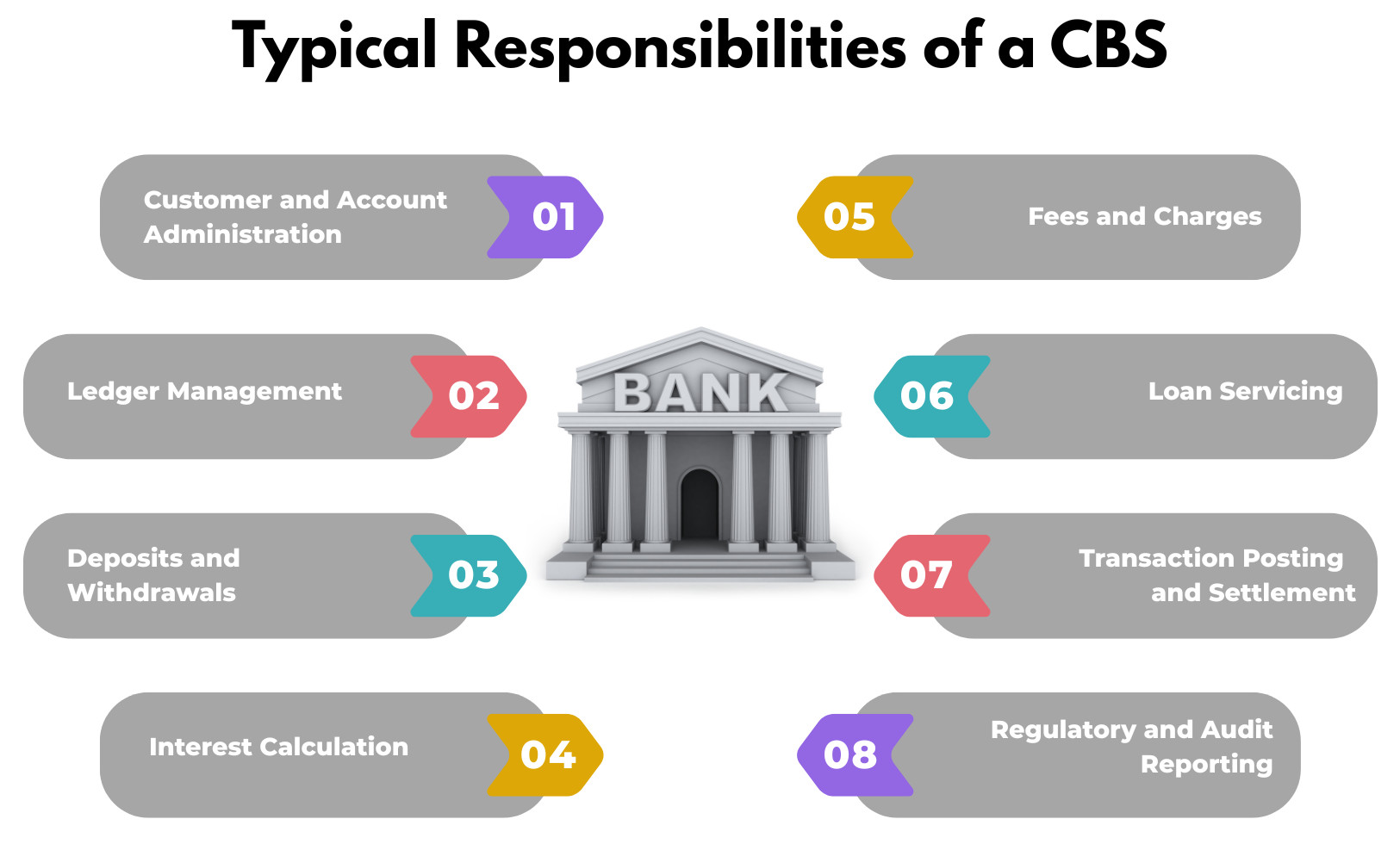 - Transaction Processing Engine: Orchestrates the execution of all real-time and batch transactions throughout the bank. It enforces posting policies, enables reversals and edits, and verifies that transactions are batched appropriately by the established cut-off times.