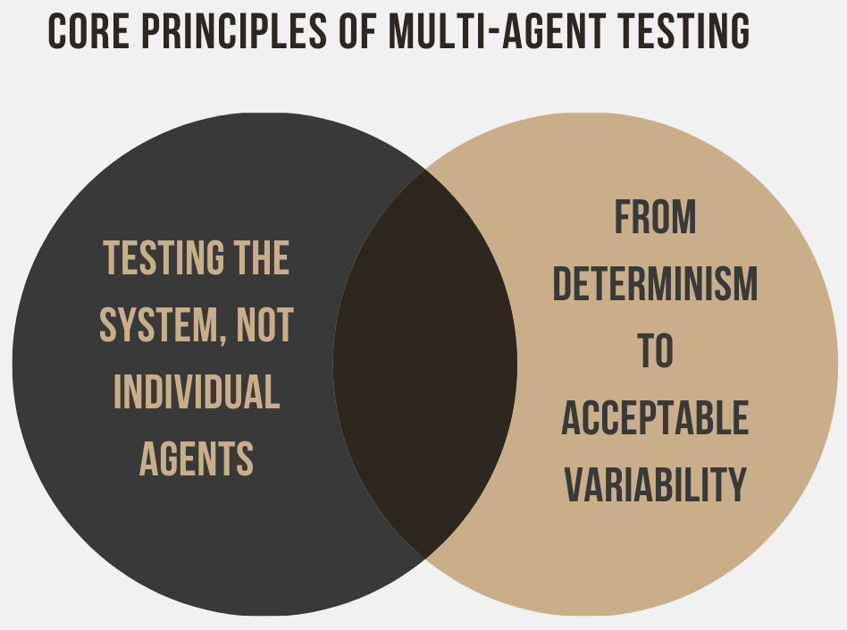 Multi-agent systems exhibit emergence, non-linearity, dynamics, coordination, and context-sensitive behavior instead. And the nature of testing changes from checking what the system is doing to testing how it behaves as the situation progresses.