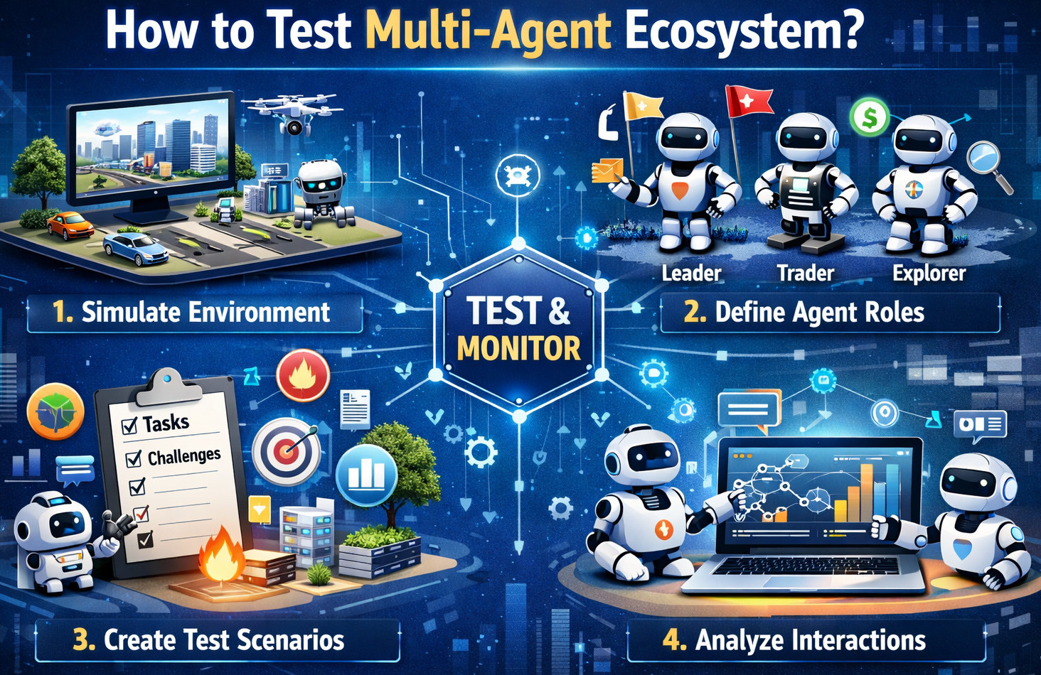 From a testing perspective, the defining characteristic is interdependence. No agent operates in isolation; every action can cascade across the system.