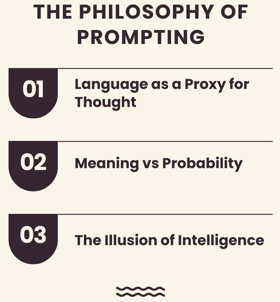 Human language is a flawed approximation of thought, reducing complex mental structures into simple chains of words. In human language, we share context, culture, and intuition that help one reconstruct what the words are not saying. AI has none of that common knowledge, so language is the only way to convey meaning. All the ambiguities, assumptions, and omissions in a prompt remain untouched and directly affect the generated text. Prompting forces a philosophical reckoning: