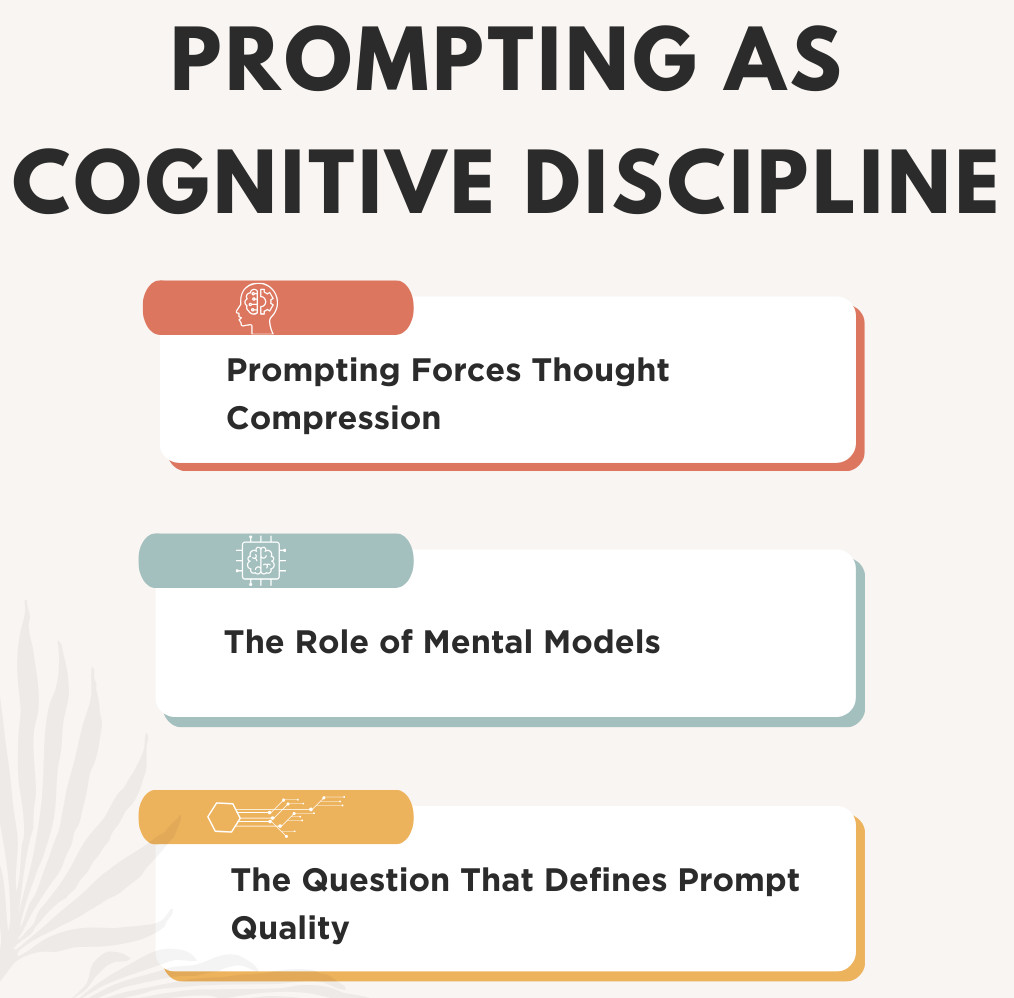 Each successful prompt is built upon an internal model of human cognition, which defines how the concept is embedded. This mental model is weak in the case of vague prompts and produces generic output. If you have a strong mental model, the prompt is well-defined, and the output is actionable. Prompting is not teaching; it is seeing if they know already.