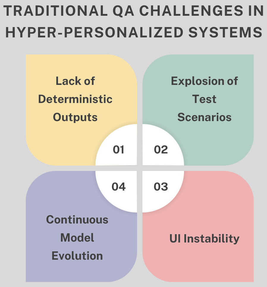Traditional QA relies on deterministic validation, which is based on a specific input yielding a predictable output. It also presumes stable UI components, controlled environments, and predictable, repeatable test results. Hyper-personalization breaks all of these assumptions by allowing for dynamic behavior that differs among users and contexts.
