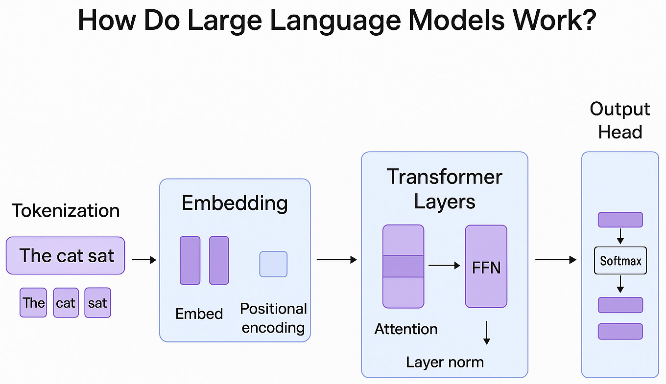 Large language models are basically a type of neural network that has been trained on enormous volumes of textual data. They are able to forecast the most likely next token (word or subword) in a sequence by learning statistical patterns of language. When this simple process is replicated on a large scale, emergent skills like summarization, reasoning, and coding support are produced.