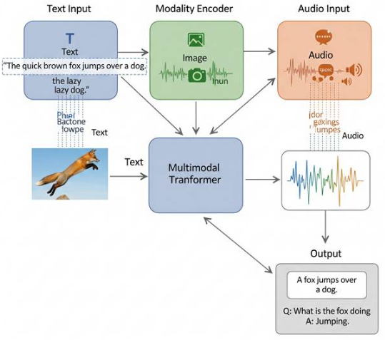 Data is projected into a shared latent space by these modality-specific encoders. The multimodal embeddings are fed into the central transformer backbone after they have been aligned. This allows the model to respond to queries such as:
