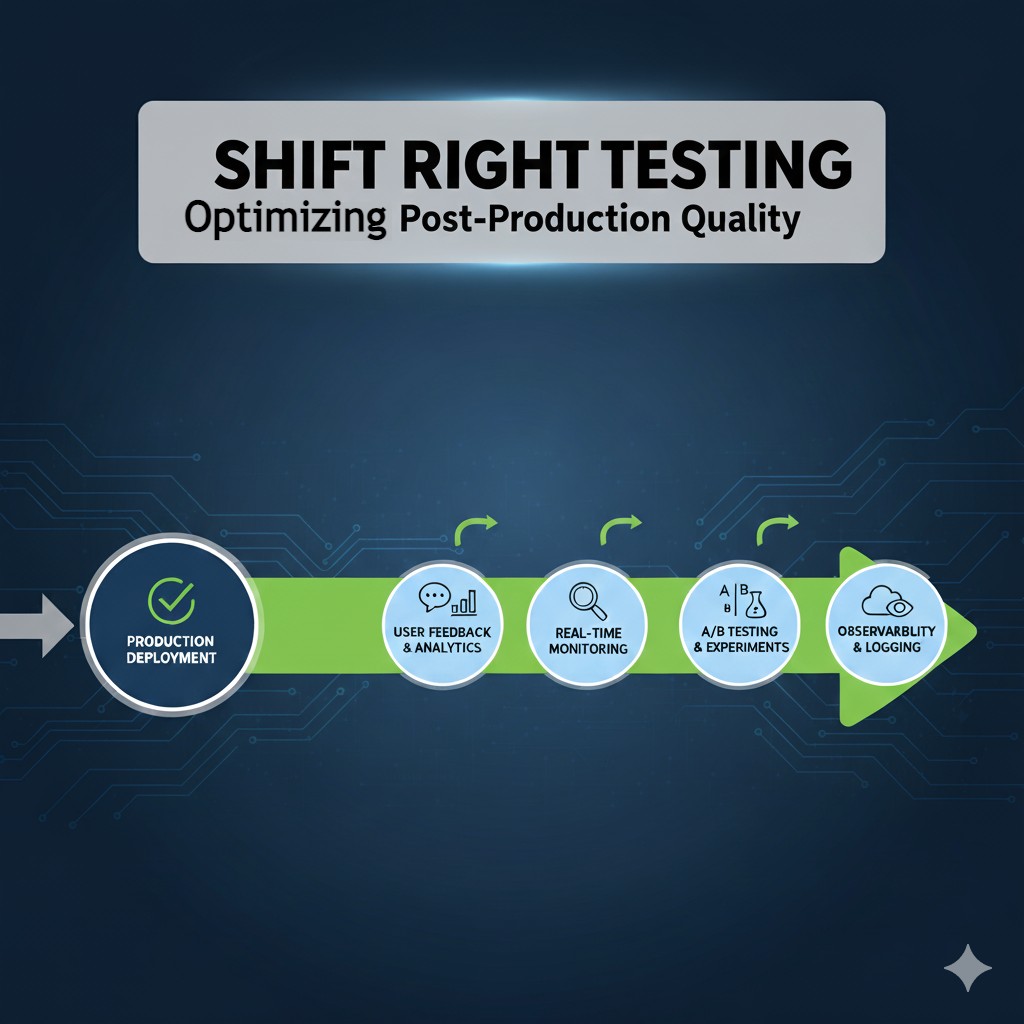 Whereas shift-left is concerned with prevention, shift-right testing is concerned with validation in production-like settings. As modern applications are constantly deployed and consumed by millions of users, real-world conditions cannot always be simulated in pre-production environments. Shift-right proposed techniques, such as canary releases, A/B testing, chaos engineering, and production monitoring, to test software behavior in live conditions. This method is centered on resilience, user experience, and constant feedback of production systems, which guarantee quality even after pre-release stages.