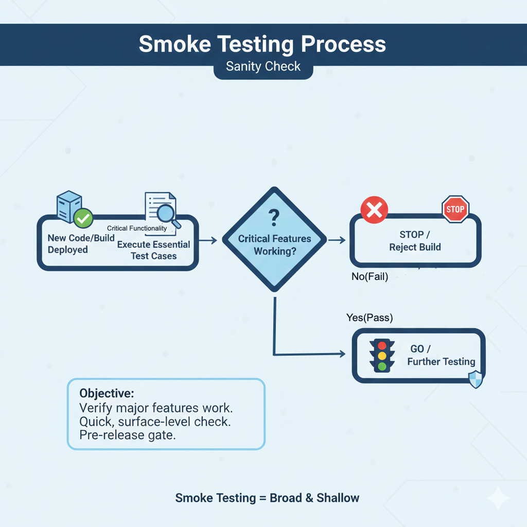 Smoke testing is a surface-level tests that test only the high-priority, basic workflows without going into deeper levels of logic or data. There are more than that where the regression testing goes, full business use cases, data interactions, UI, integration, and error handling. Thus, smoke testing is a rapid safety check, whereas regression testing is an exhaustive health check.