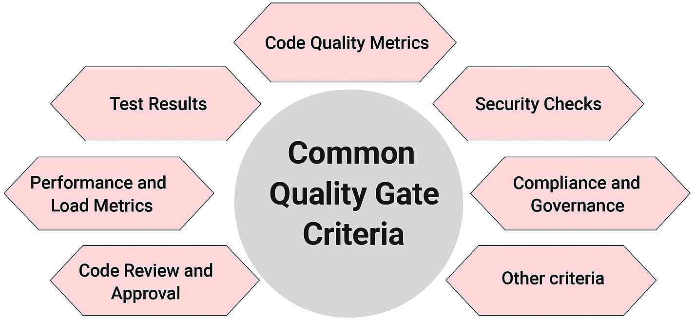 Quality gates are customized based on organizational goals, project type, or compliance requirements. However, several criteria or conditions that are widely used across industries are listed here: