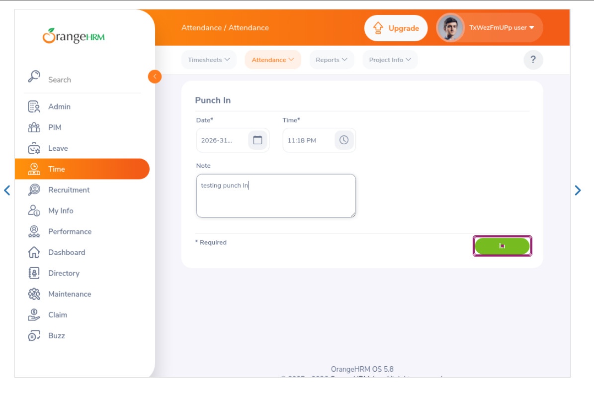 enter "Admin" into "Username" enter "admin123" into "Password" click "Login" click "Time" //punch In click "Attendance" click "Punch In/Out" enter "testing punch In" into "Type here" click "In"