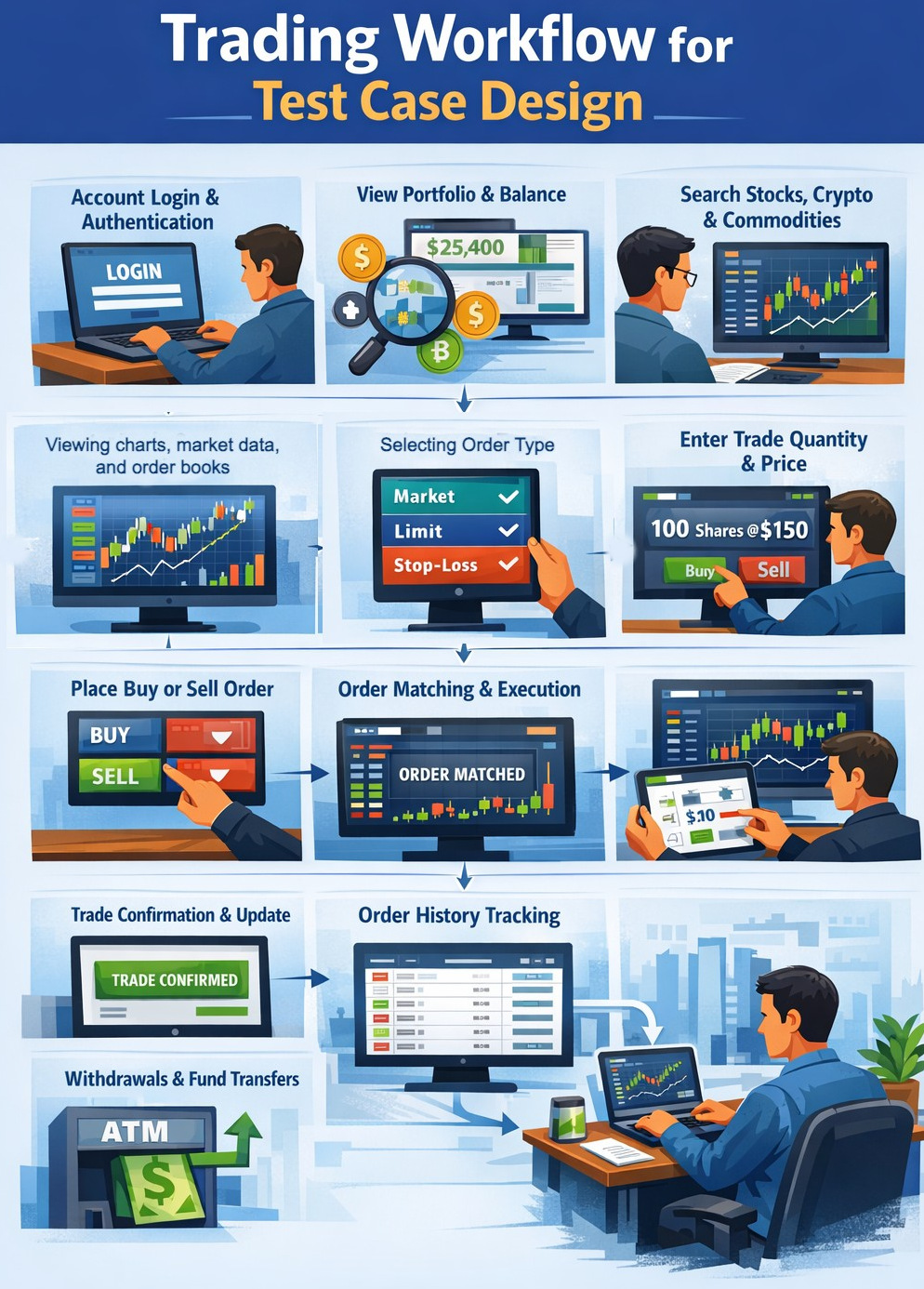 Testers need to gain knowledge on how the trading system works from the user perspective before writing test cases. A clear lens on the trading workflow facilitates knowing where exactly the transactions, validations and system interactions happen. With this knowledge, QA teams are able to craft test cases that closely mirror actual trading behavior and system interactions. A typical trading workflow includes: