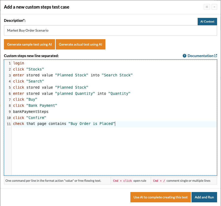 Now, let’s see a scenario for a market buy order using testRigor.