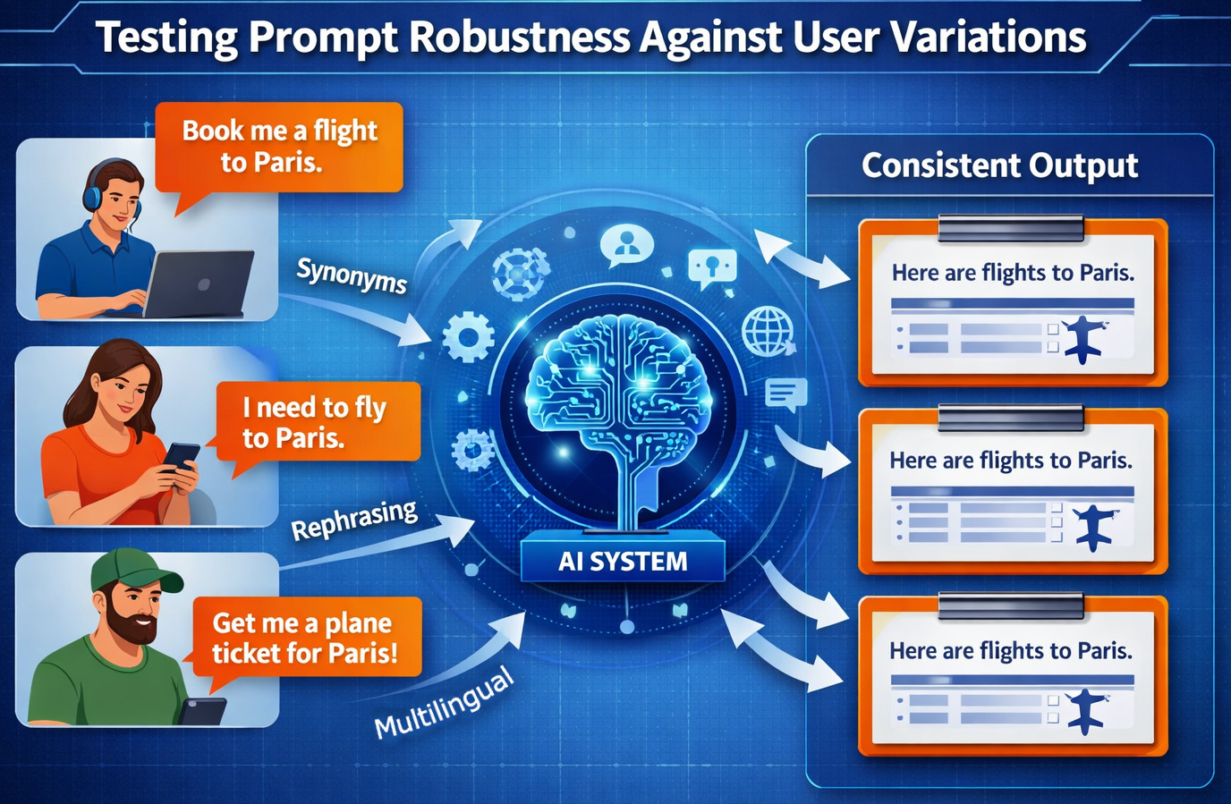 Each variation uses different vocabulary, grammar, and tone. A robust AI system must understand all these prompts as equivalent requests.