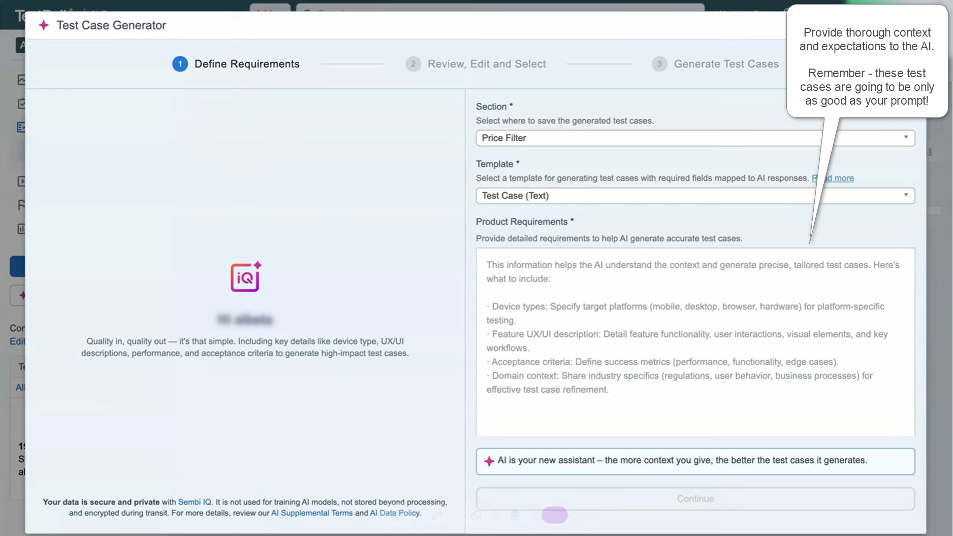 TestRail has recently introduced AI capabilities to assist with creating test cases. The Sembi IQ AI engine has introduced several features within TestRail, primarily focused on test case creation and, with more features planned, enhancing test management and efficiency. The main AI capabilities currently available center around test case generation with a “human-in-the-loop” approach.