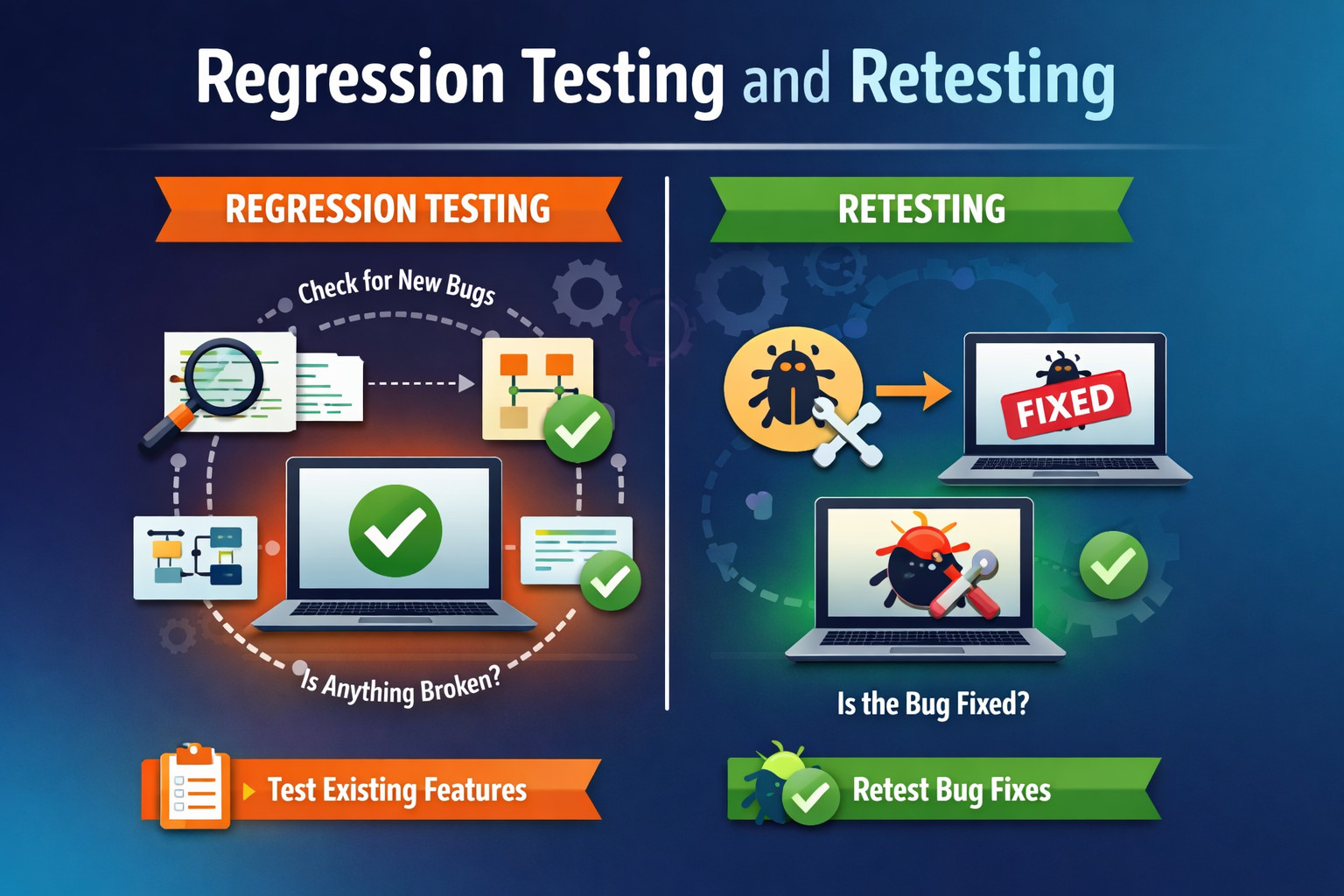 | Regression testing helps maintain long-term system stability and release confidence. | Retesting helps confirm immediate fix correctness before moving forward with a release. |