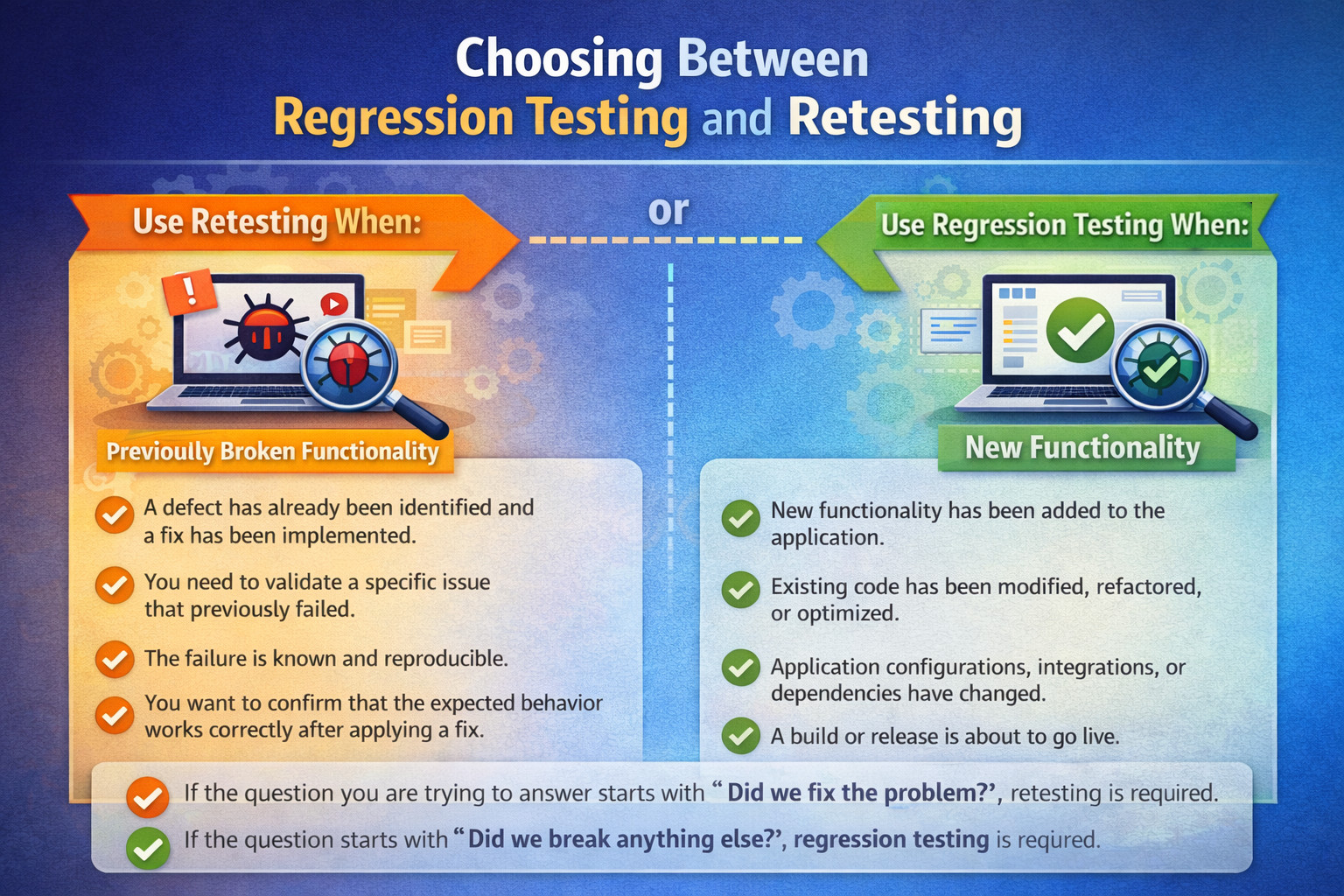 Choosing between regression testing and retesting depends on the type of change being validated and the risk involved. Understanding when to use each helps teams test more efficiently and avoid unnecessary or misplaced testing efforts.