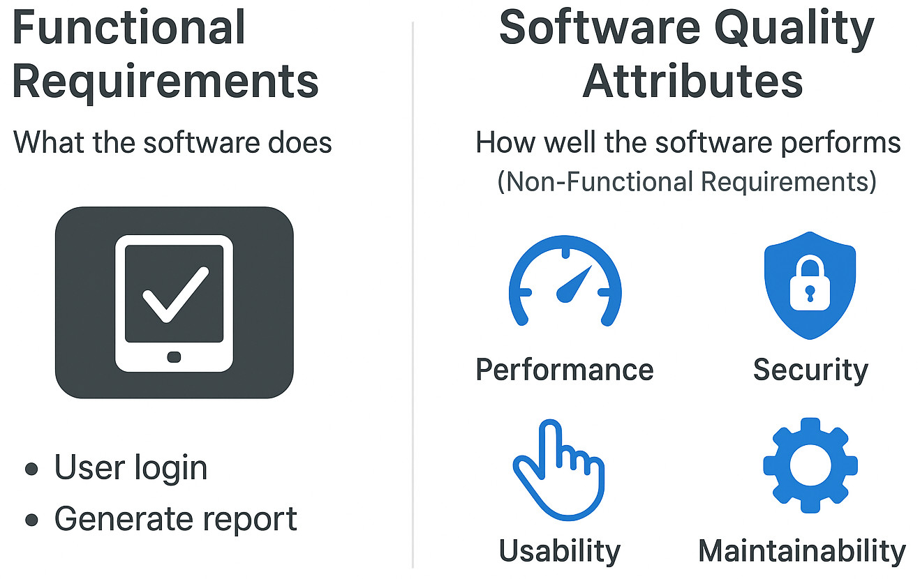 Here’s when software quality attributes step in. Those traits turn the vague sense of quality into something clear. Instead of only focusing on functions, they show how smoothly a system runs. But often, these aspects weigh just as heavily. Or even heavier, compared to the features listed in user stories.