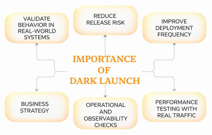 • With dark launch, engineering teams can validate performance, scalability, compatibility, and operational readiness of the new functionality in real-world conditions.