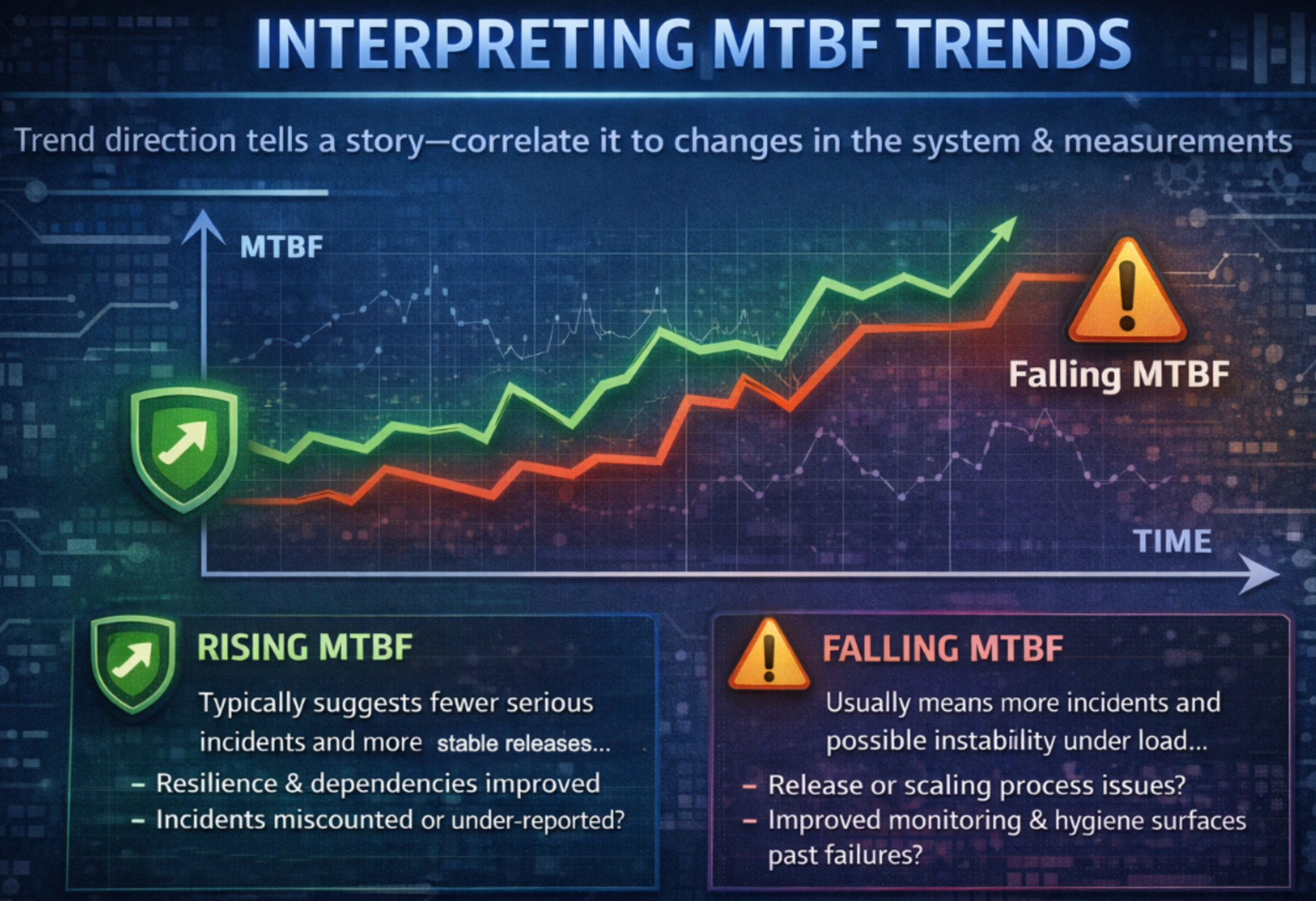 MTBF is most useful when you track it over time, because the direction of the trend tells a clearer story than any single value. To interpret it correctly, always consider what changed in the system and in your measurement methods.