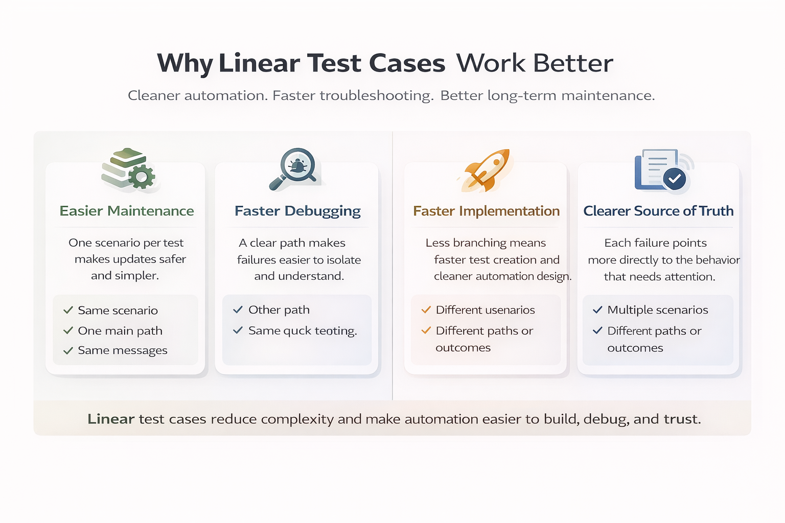 With a linear test case, the scope is smaller and clearer. When you update it, you are updating one scenario instead of trying to protect three or four at the same time.