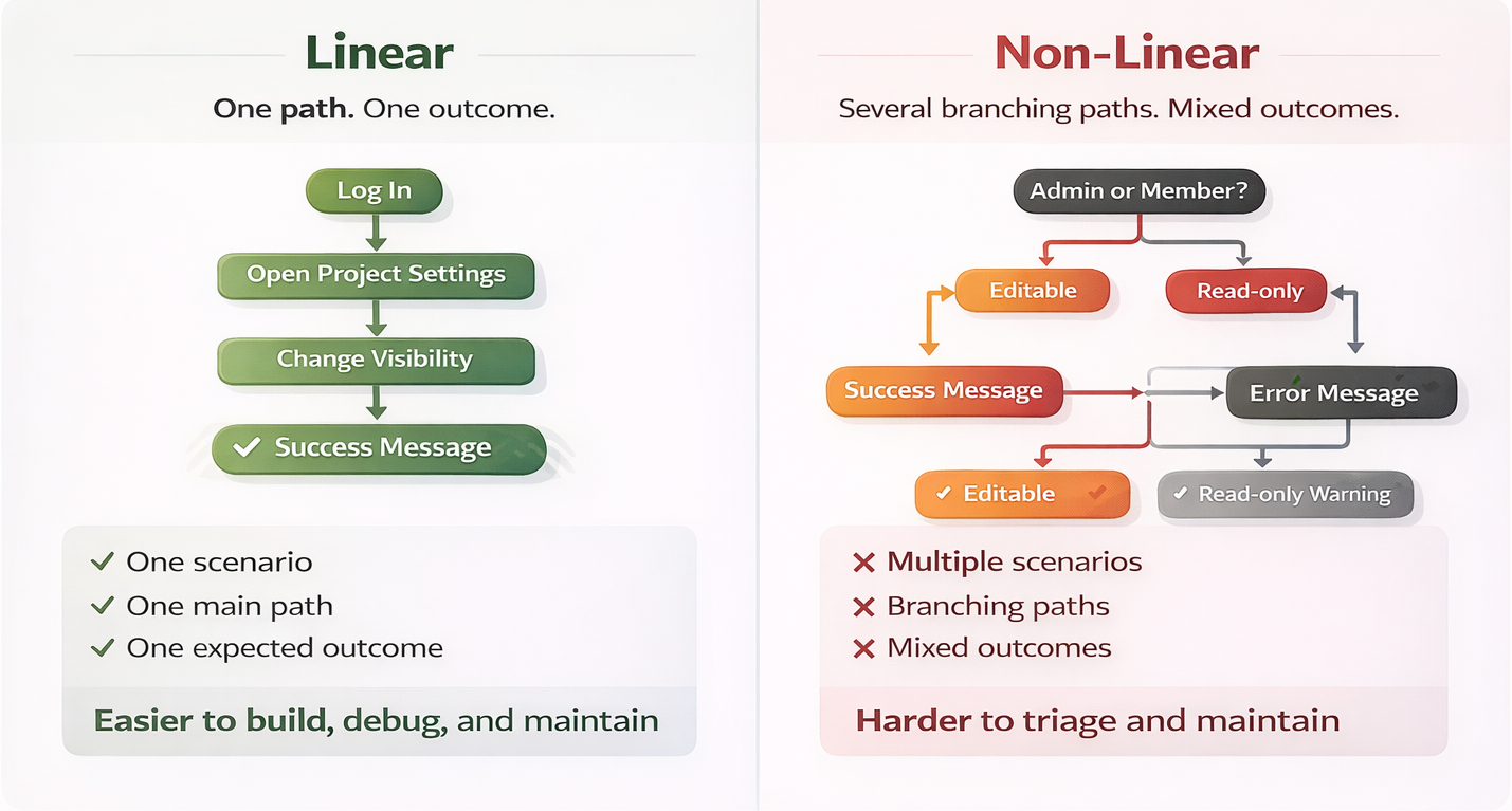 By contrast, when a non-linear test fails, the first question is often not “What broke?” It is “Which branch were we even in?”