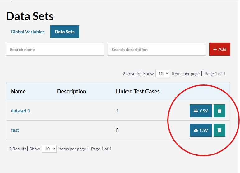 To use this feature, navigate to the Test Data page, open the Data Sets section, and download your desired Data Set as a CSV file.
