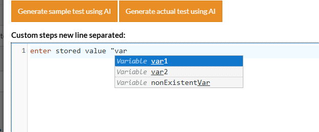 Caption: testRigor’s new autocomplete functionality for variable names.